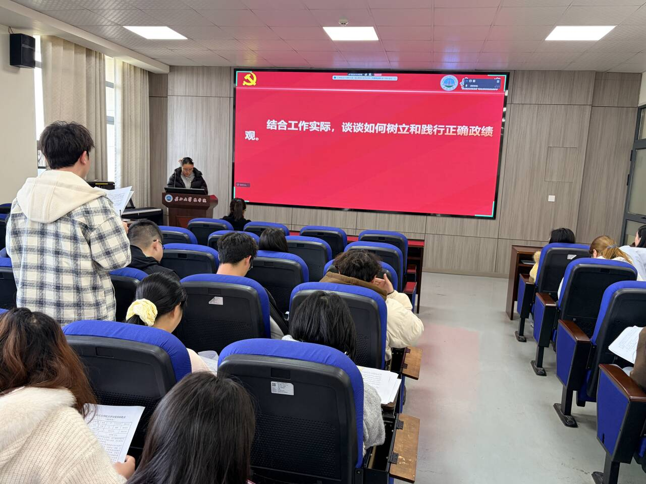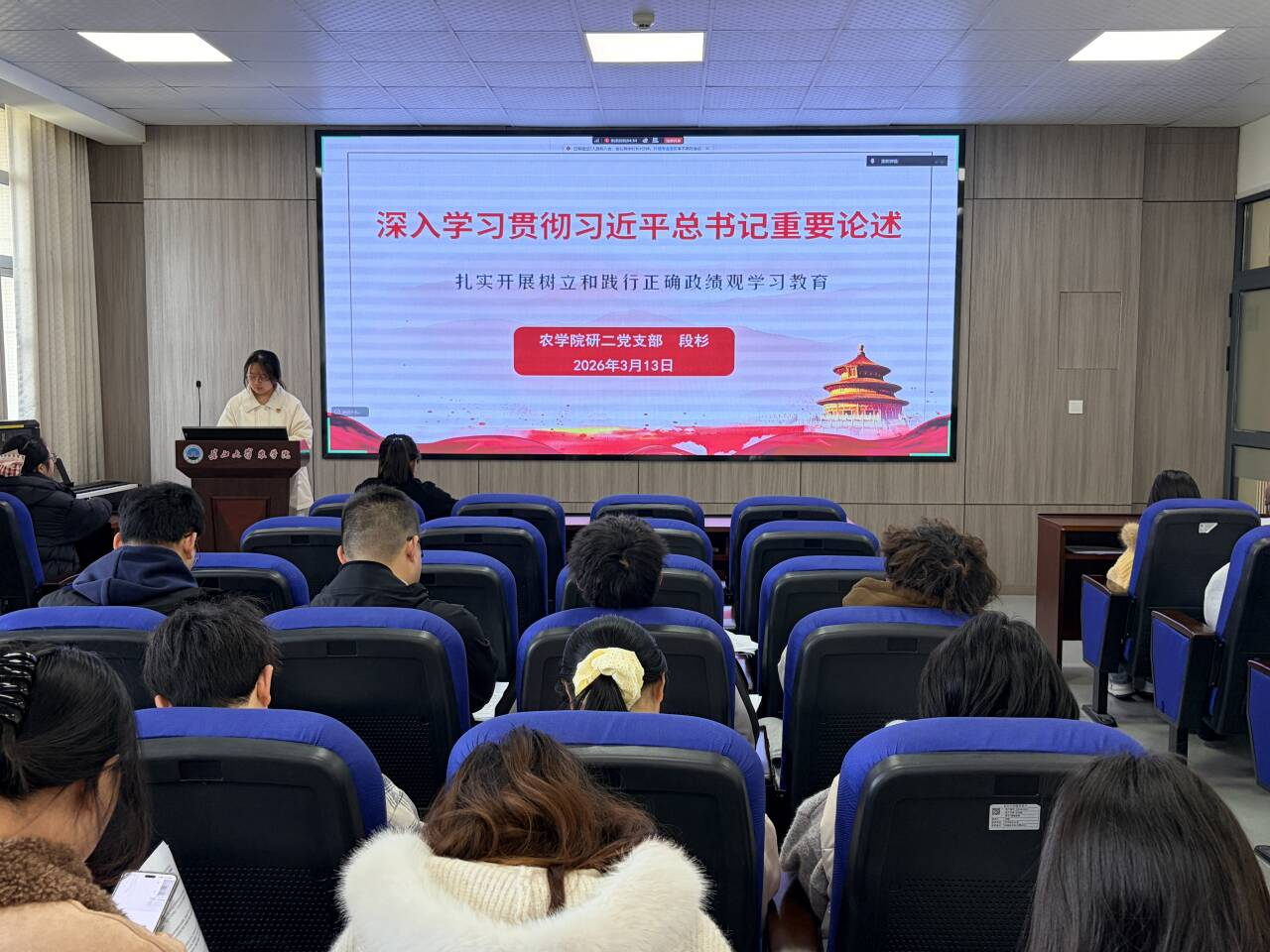 段杉同志以“树立正确政绩观,勇担农业新使命”为题讲授微党课,紧密结合习近平总书记关于树立和践行正确政绩观的重要论述,系统阐释学习教育的重大意义、实践要求与落实路径,引导党员同志筑牢思想根基、锤炼实干作风,凝聚起以正确政绩观引领农业专业发展、服务“三农”建设的奋进力量。接着,进入理论学习环节,周洁同志围绕习近平总书记在二十届中央纪委五次全会上的重要讲话展开分享,解读了会议背景意义、讲话核心要点与六大重点任务,并阐述了贯彻落实的具体举措,最后总结了讲话的核心要求与部署。韩昕同志围绕《让愿担当、敢担当、善担当蔚然成风》主题,阐释担当的意义与内涵,分享优秀党员担当事迹,结合农科学子身份说明践行担当的方法,并强调要将担当精神融入行动、实干笃行。