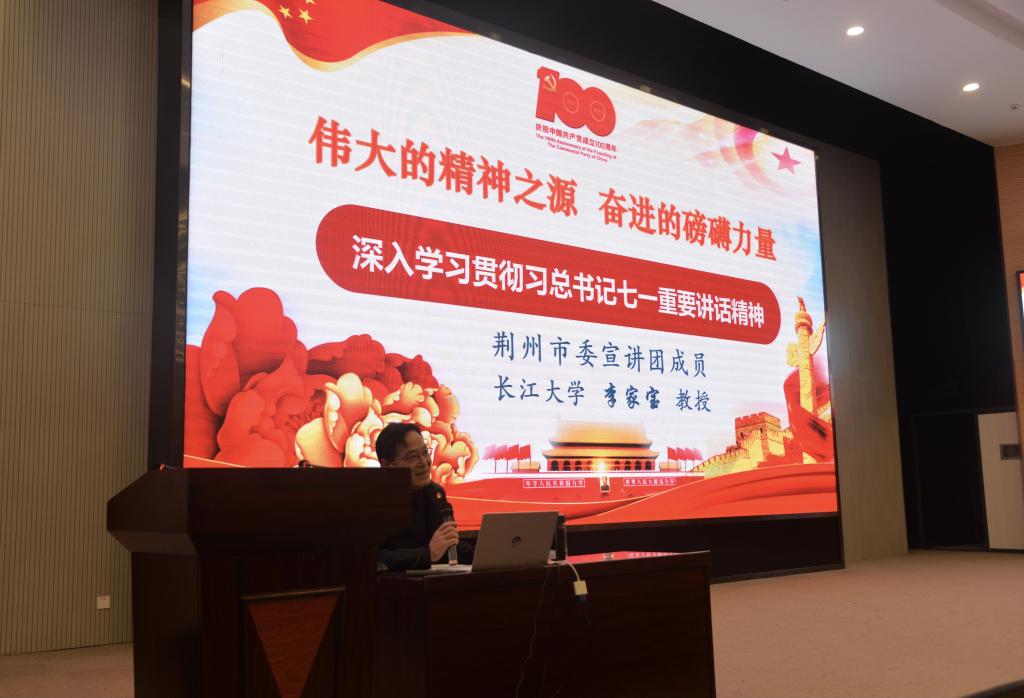 通讯社讯(通讯员 李慧明/摄 李雅倩/文)为贯彻落实习近平总书记在庆祝中国共产党成立100周年大会上的重要讲话精神,11月10日晚,我校原任副校长、荆州市委宣传部讲师团首批特聘专家李家宝教授与正规滚球app平台官网师生面对面,宣讲了习近平总书记“七一”重要讲话精神,报告会由正规滚球app平台官网党委副书记谭亮魁主持。