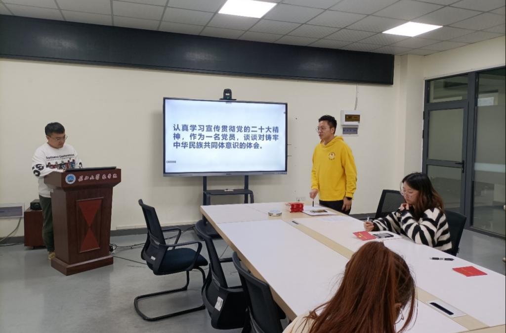 会议最后,支部书记付雪娇同志作总结发言。党的十八大以来,党坚持把铸牢中华民族共同体意识作为新时代的民族工作主线。铸牢中华民族共同体意识,首要的就是加强党对民族工作的统一领导,并在党的领导下,发挥每个支部的战斗堡垒作用以及各个党员的先锋模范作用,把民族相关政策学明白、讲清楚。她谈到自己作为一名思政辅导员,每学期会组织召开一次少数民族学生思想座谈会,了解学生近期思想动态。同时强调,所有党员在日常生活中,要尊重不同民族信仰和文化,真正做到习近平总书记所说的“各民族要像石榴籽一样紧紧抱在一起”、“民族团结一家亲”。