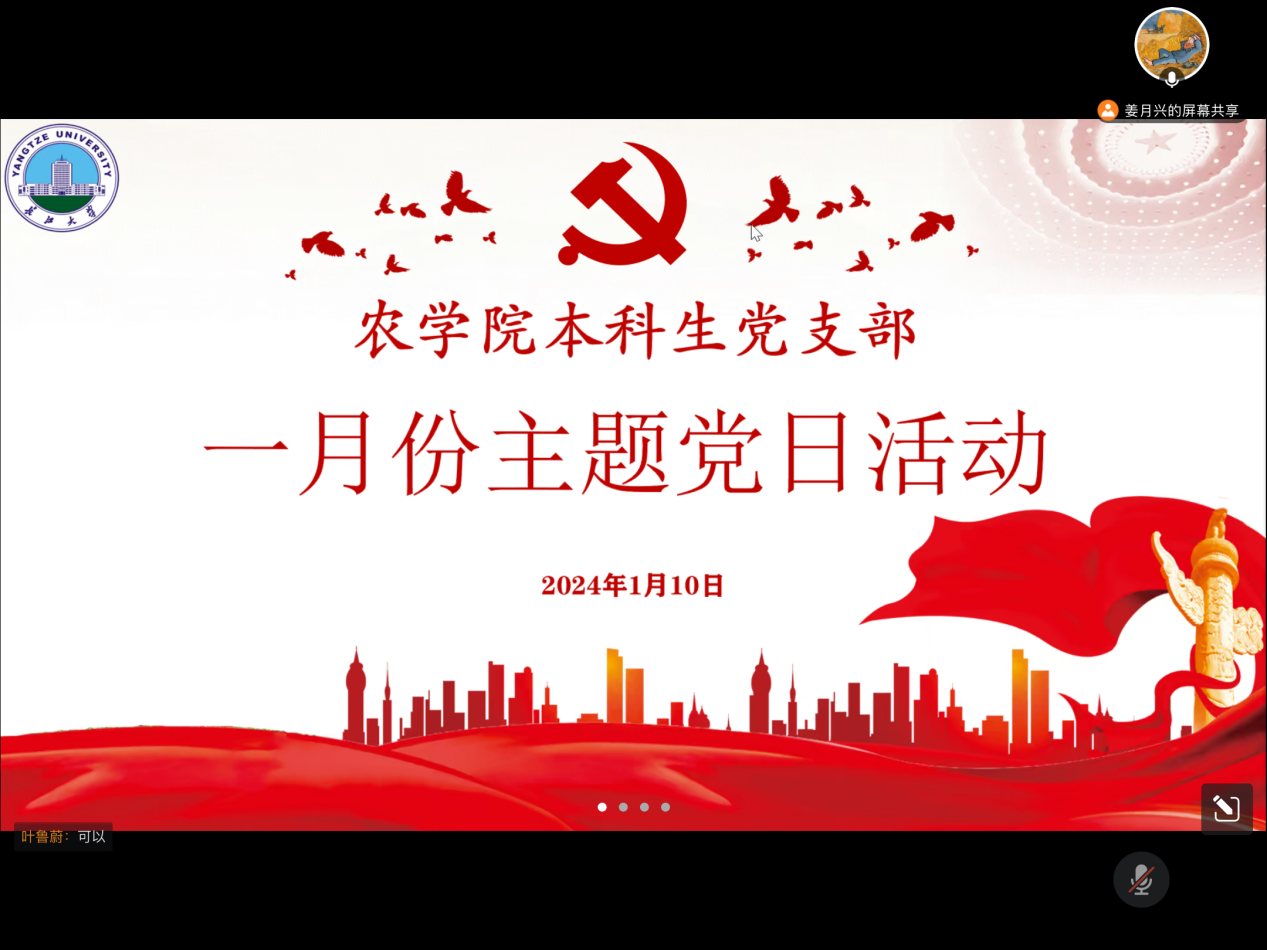 (通讯员 徐志鹏)1月10日晚上19:00,滚球app官网本科生党支部在腾讯会议开展一月主题党日活动,支部党员应到44人,实到44人,本次活动由支部党员姜月兴同志主持。