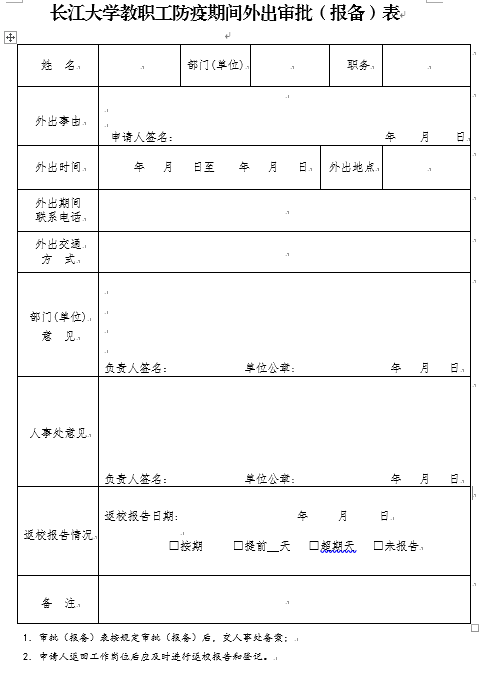 正规滚球app平台官网教职工防疫期间外出审批(报备)表