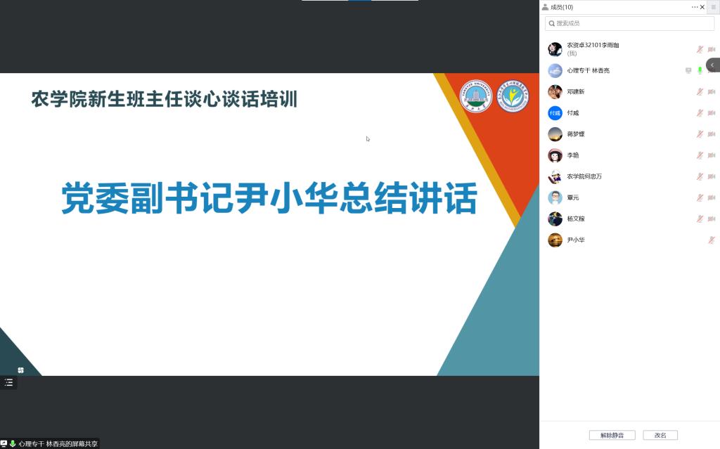 培训结束后,尹小华提出具体要求,班主任要积极学习并向班级新生宣传心理健康知识,营造起积极、健康、向上的班级文化;在班级内要适当组织开展有益于学生心理健康的教育活动,及时了解掌握学生的心理状态;日常管理中,若发现班级有心理异常的学生要第一时间与学工队伍联系,要全程参与学生心理危机干预工作,做好家校沟通的桥梁。