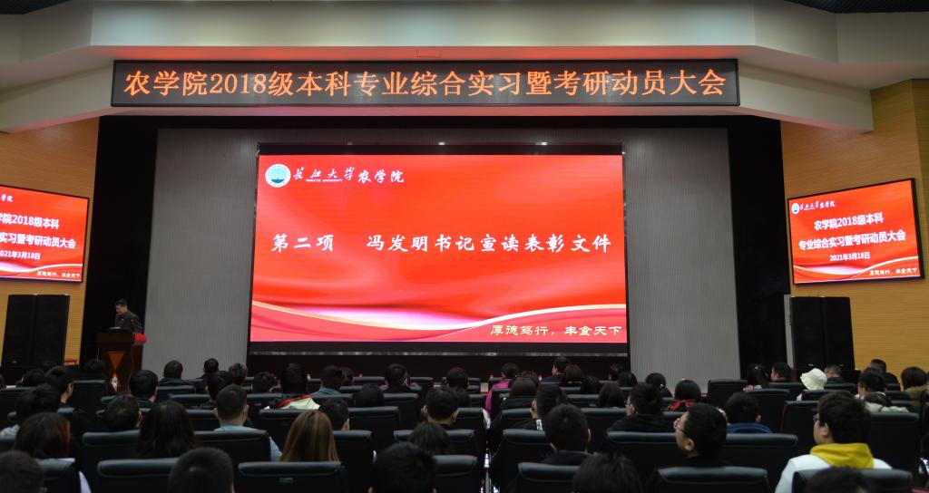 通讯社讯(学生记者 黄俊杰/文 刘思慧/摄)为增进学生对专业综合实习的认识,提高学生考研积极性,树立考研深造的信心。3月18日晚7时,滚球app官网于农科大楼1058报告厅举行2018级本科专业综合实习暨考研动员大会。学院党委书记冯发明副教授、副院长张文英教授、副院长方正武教授,两名专职辅导员代表、2018级和2019级全体班主任老师与本科生,团委学生会2020级全体干事参与了此次大会,会议由院党委副书记谭亮魁主持。