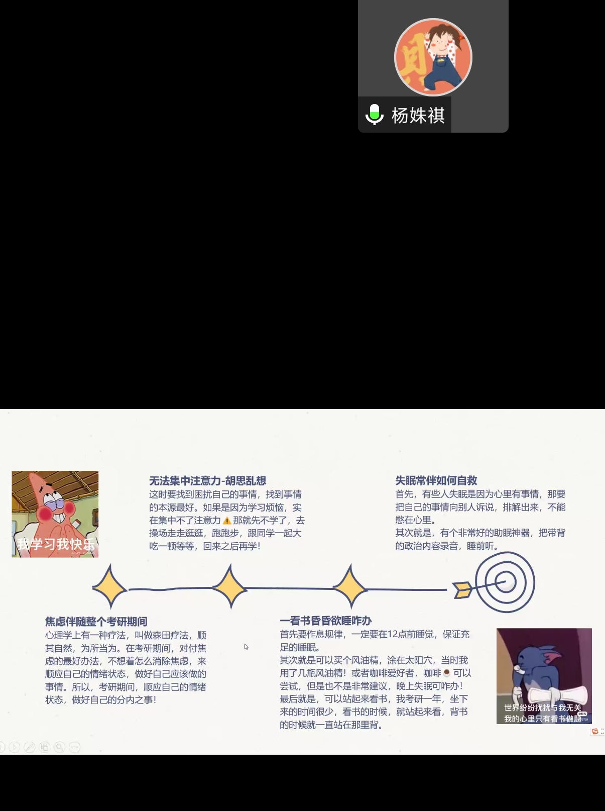 会议第二部分由研究生杨姝祺进行考研经验分享交流。杨姝祺首先向同学们介绍了自己的考研历程,并分享了她的考研日程表。她在讲述中以自身经验为例,提醒广大考研学子关注网上报名、咨询以及考试时间这些细节。最后,对于同学们报考研究生所遇到的一系列常见的问题她也一一解答。