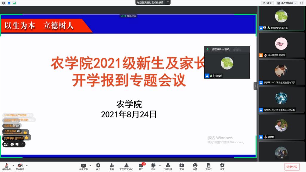 (通讯员 付雪娇)为传达学校关于新生开学返校相关工作精神,及时回应新生及家长迫切关心的问题,8月24日晚8点,正规滚球app平台官网利用腾讯会议召开“2021级新生及家长开学报到专题会议”,参加本次会议的有学院党委副书记谭亮魁、副院长张文英、班主任、辅导员、全体新生及父母。