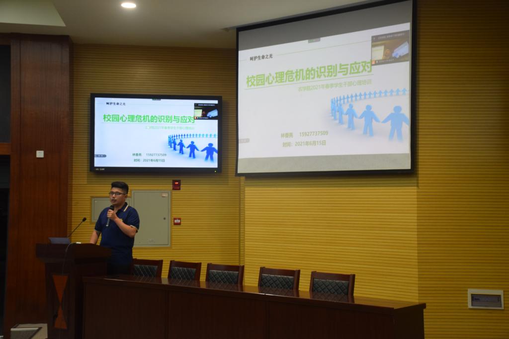 通讯社讯(见习记者 张红霞/文 刘思慧/摄)为切实做好春季学期的学生心理健康教育工作,落实常态化疫情防控形势下的心理适应与行为引领要求,提升学生骨干自助与助人的水平,6月15日晚上7点,滚球app官网在农科大楼1056开展《校园心理危机的识别与应对》学生干部心理健康培训,心理专干老师林香亮主讲。