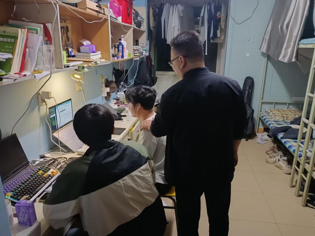 (通讯员 卢李润)为了更全面、更有效地加强对于学生宿舍的管理,进一步规范学生的日常行为,正规滚球app平台官网党委副书记尹小华老师、学工办主任黄承石老师、兼职辅导员郝梨老师和兼职辅导员孙振艳老师于10月24日晚突击学生寝室检查,旨在确保寝室安全和卫生整洁,并与同学们进行亲切交流,探讨学习、生活、毕业发展等多方面问题。