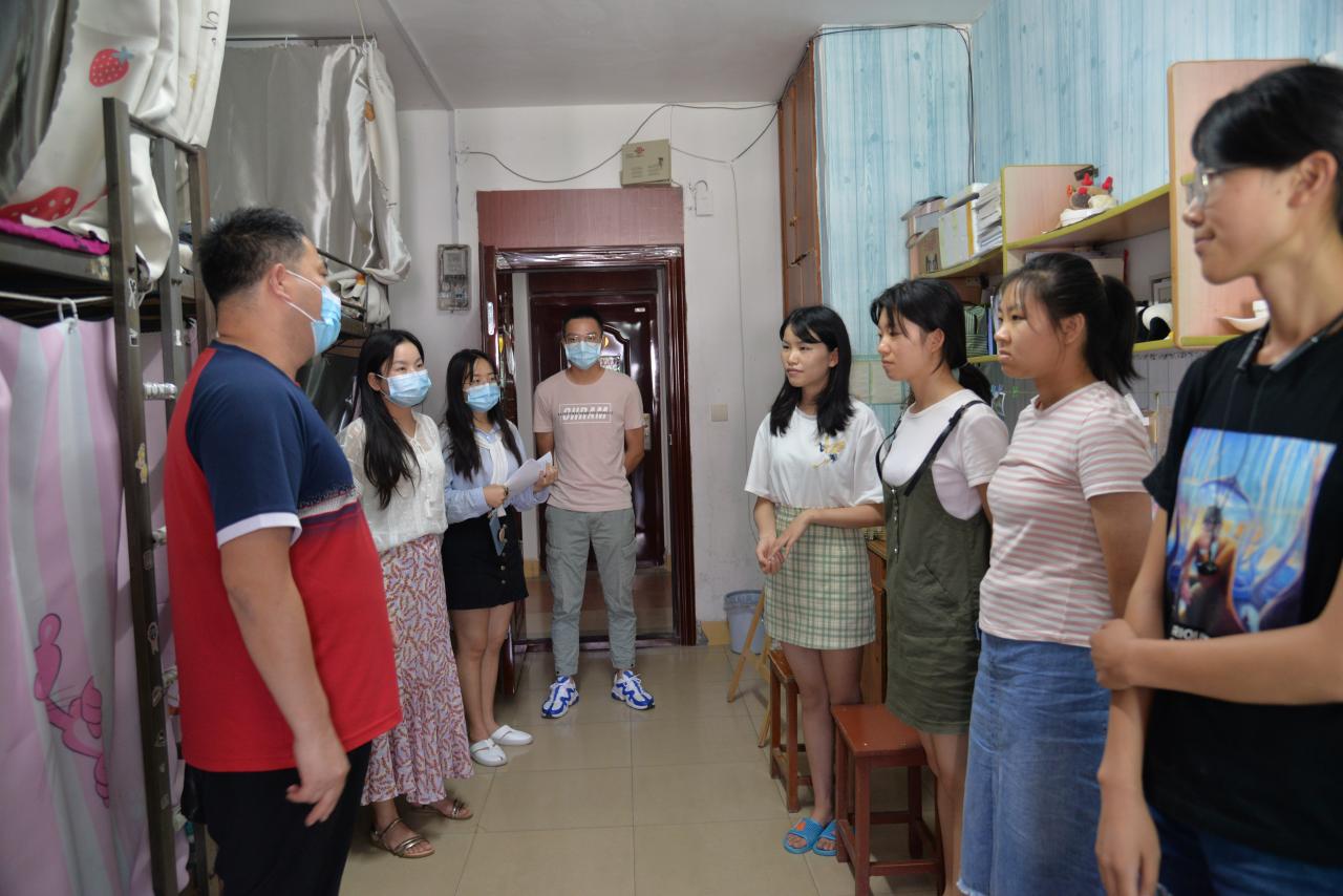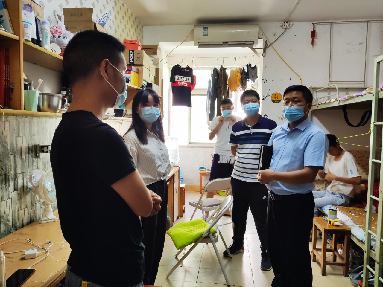 通讯社讯(学生记者 覃杨)为进一步强化疫情防控期间返校学生的健康安全防范意识,营造良好的寝室卫生环境,了解返校后学生的生活学习状况,9月3日14:00,正规滚球app平台官网副院长方正武、党委副书记谭亮魁、学工办主任刘庆、分团委书记侯聪、辅导员付雪娇及辅导员林香亮带队走访了正规滚球app平台官网本科生寝室。